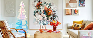 Sunny shades, curated artworks and relaxed rattan furniture combined with the kaleidoscopic Wild Child Christmas tree create pure sunshine and rainbows in this welcoming living room.