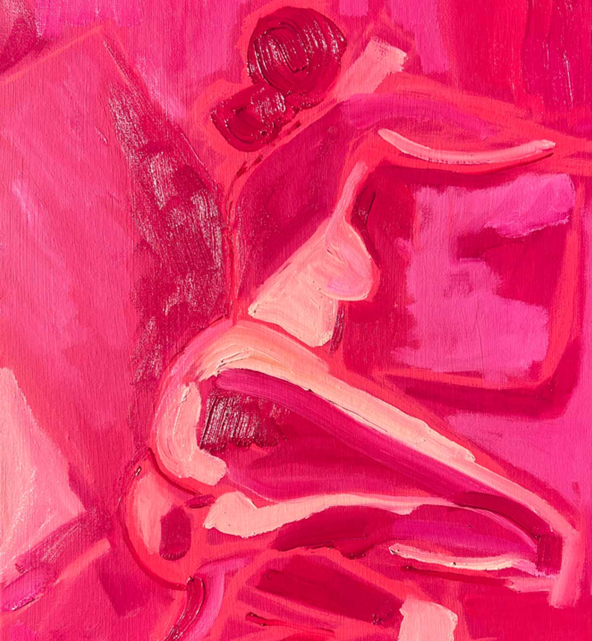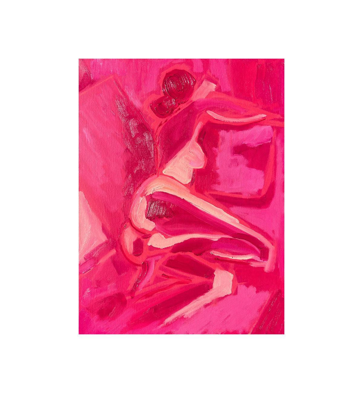 I am curious about strong shapes and it was important for me to capture these within all the works. Gestural and textured paint application helps me find the form and give definition, I played with a number of colour palettes, rich earth tones played against khaki green and warm blues for the portraits, magenta and pink on the nude.’