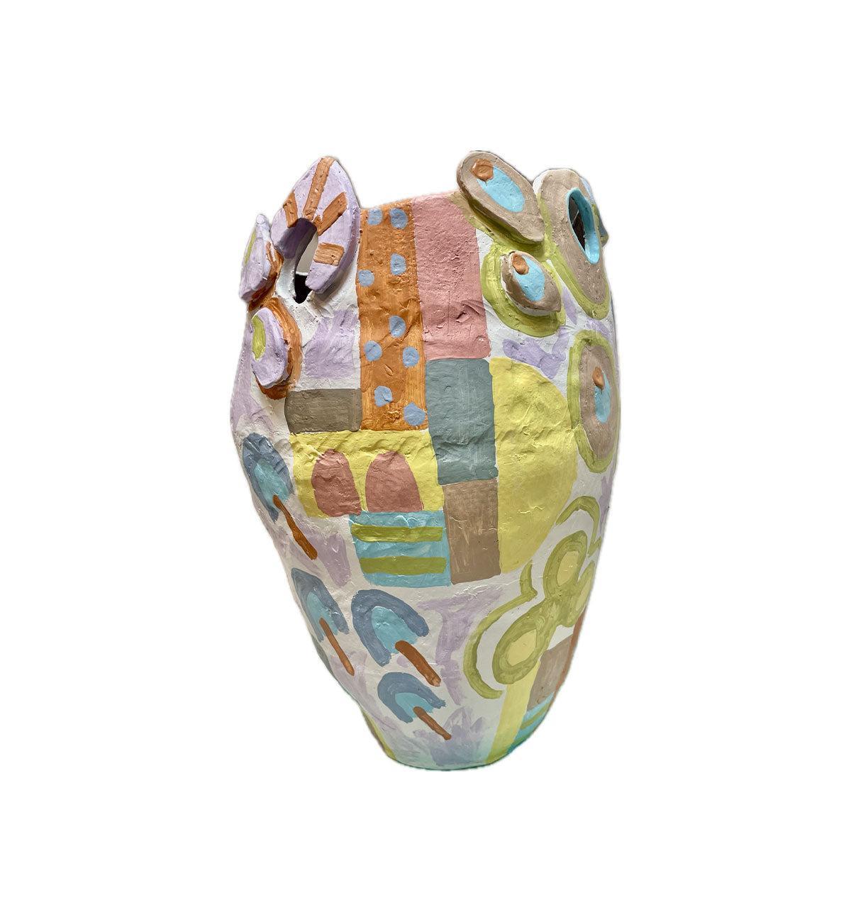 Delahunty Spencer’s vessels and paintings have evolved from an exploration of her current ‘role’ in life. ‘I am an ‘empty nester’ post-menopausal’ woman, a motherless adult ...my role as a nurturer, a mother, and carer of my mother, is slowly being redefined. I lurch from giddy excitement about my new ‘freedom’ to feelings of being slightly ‘untethered’. I am exploring myself as a vessel, the container. My four beautiful children are little vessels of promise, receptacles of my love and dreams.’