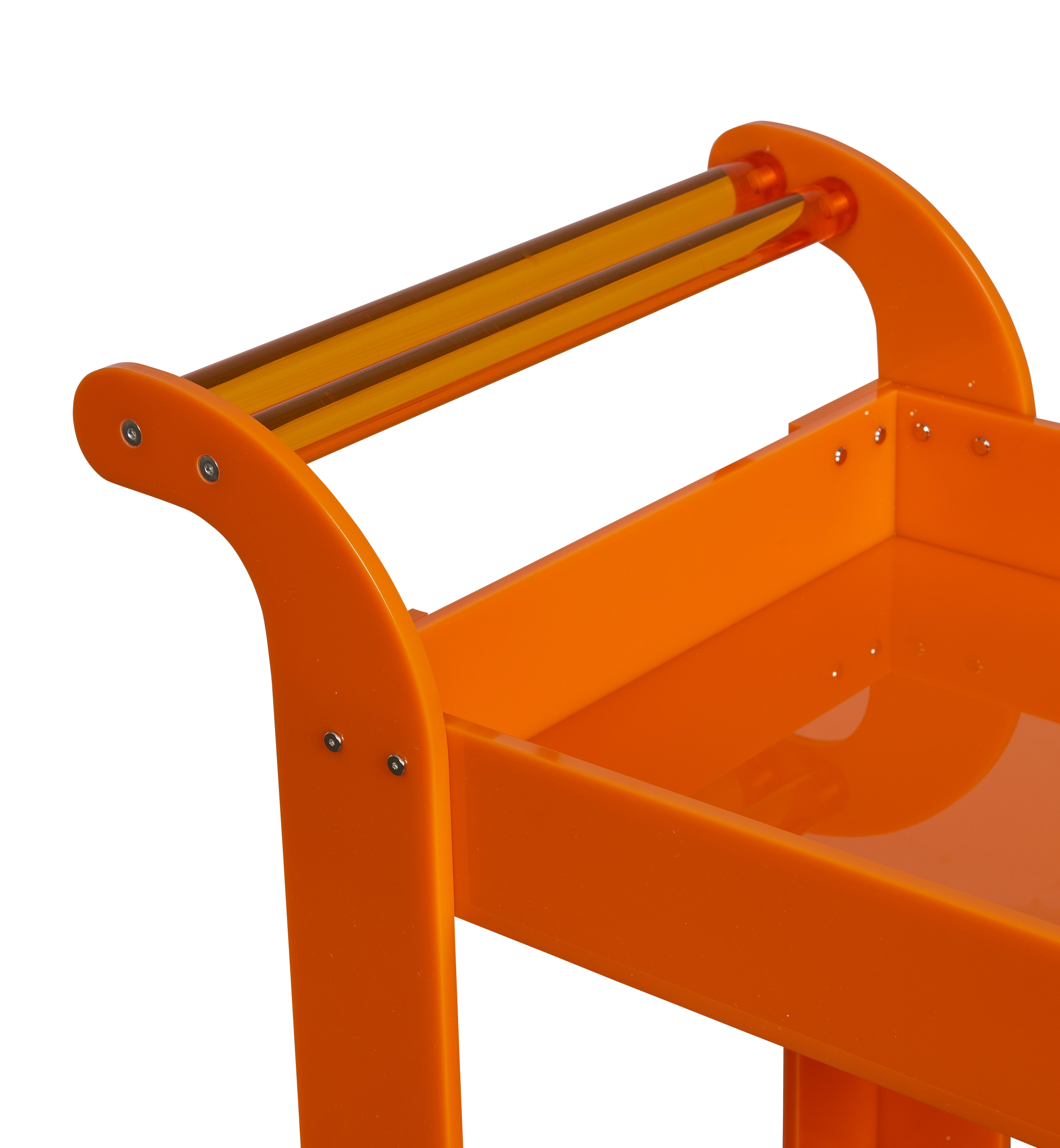 Say hello to the Smoke Bar Cart. Transparent and glasslike, the orange hue and contemporary design is made from formed acrylic.