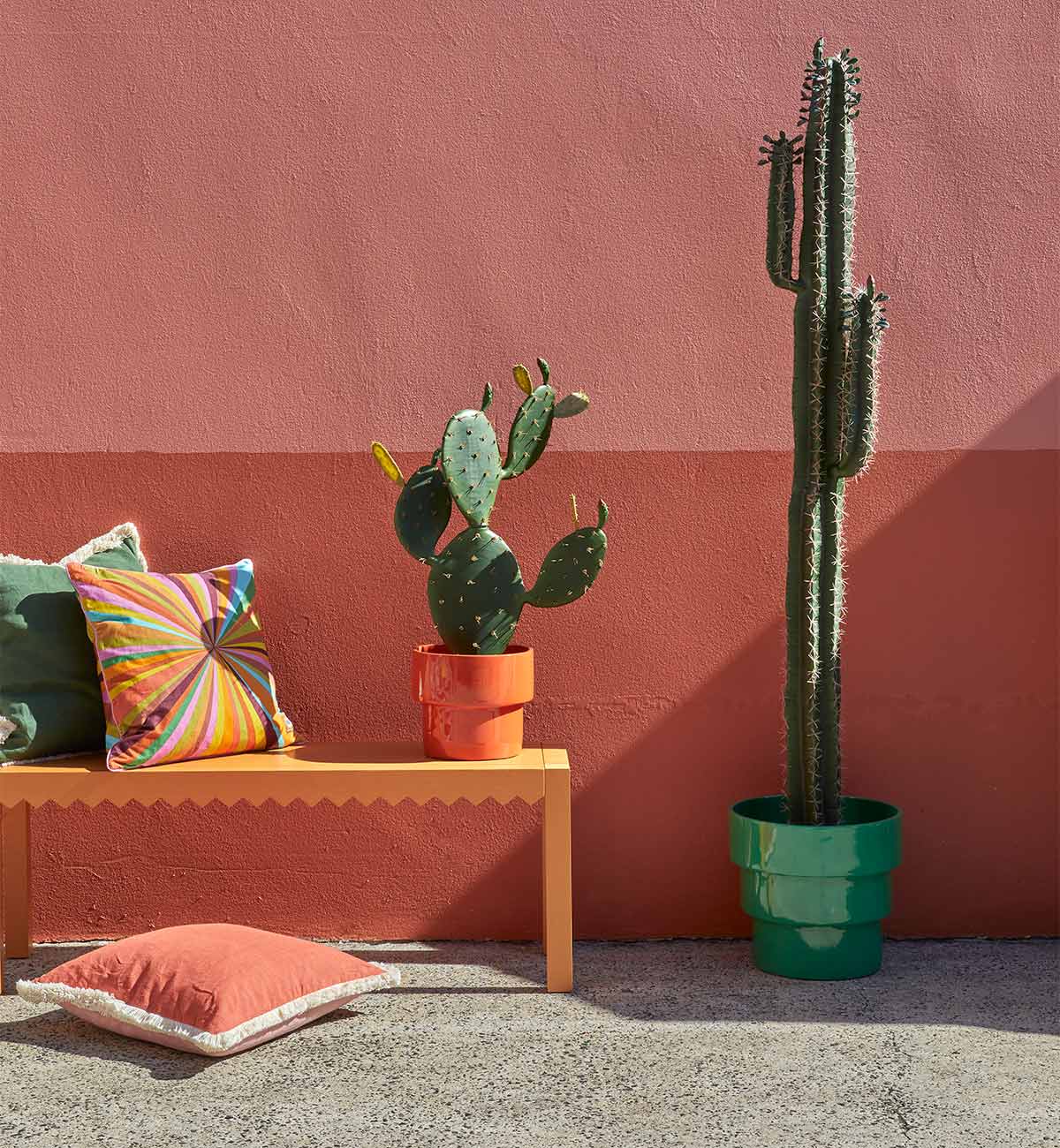 A bold statement from the Ola Mexicola collection, the Jagger Bench pairs sculptural form with vibrant colour. Featuring the collection’s signature zigzag edge in a vibrant painted timber, it’s perfect for a hallway, end of bed, or casual seating. Available in Fuchsia or Inca Sand.