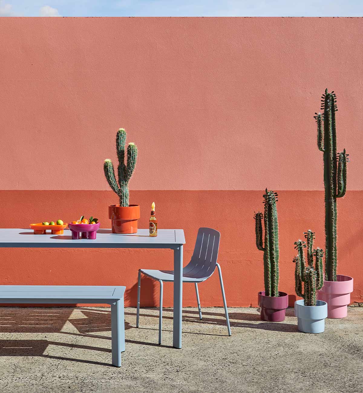 Constructed in all-weather aluminium and powder coated in a super fresh palette, this collection has been designed to mix or match with our Slim Dining Chairs.