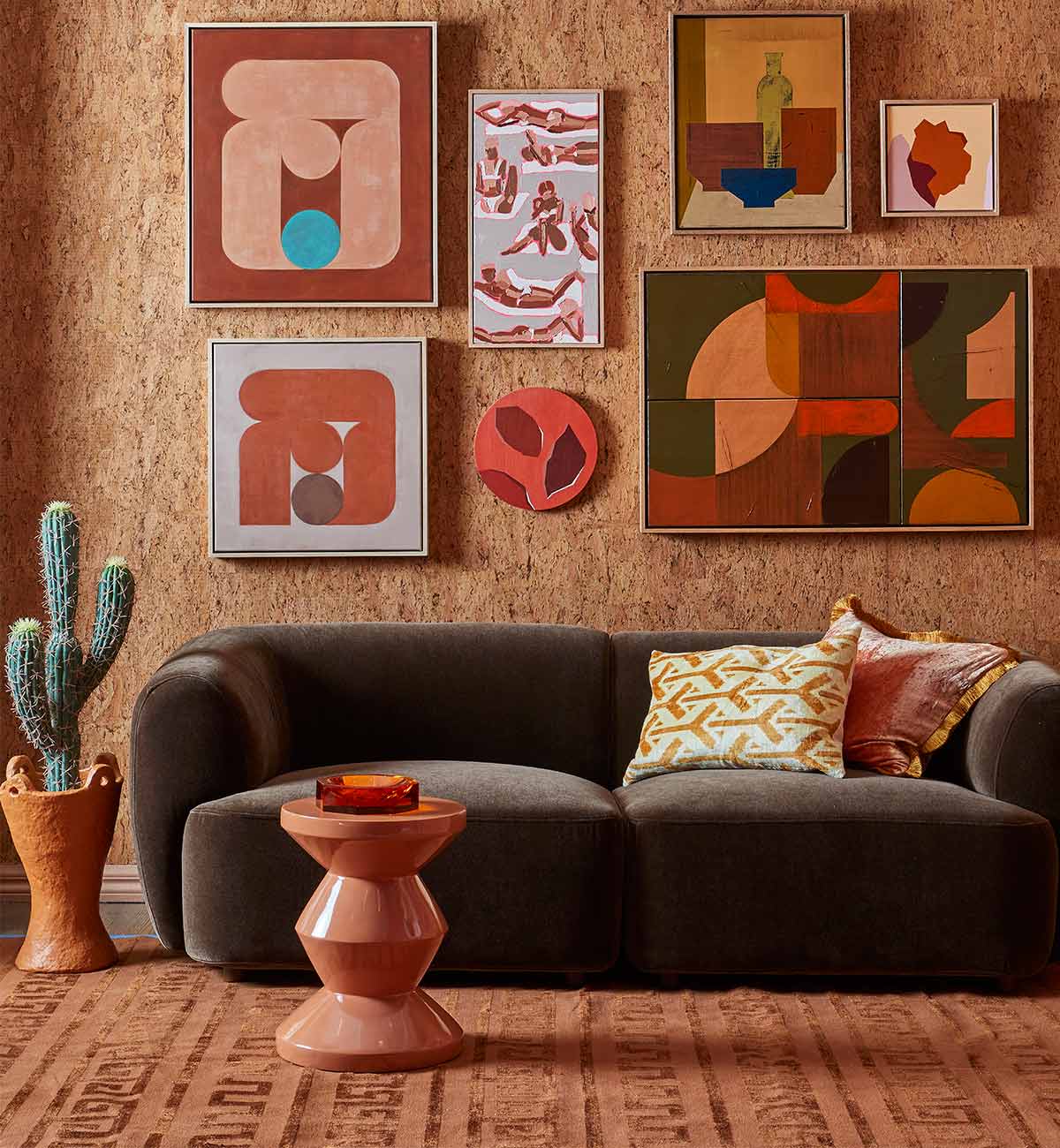 Living room with a brown couch, decorative pillows, and abstract wall art on a textured wall.
