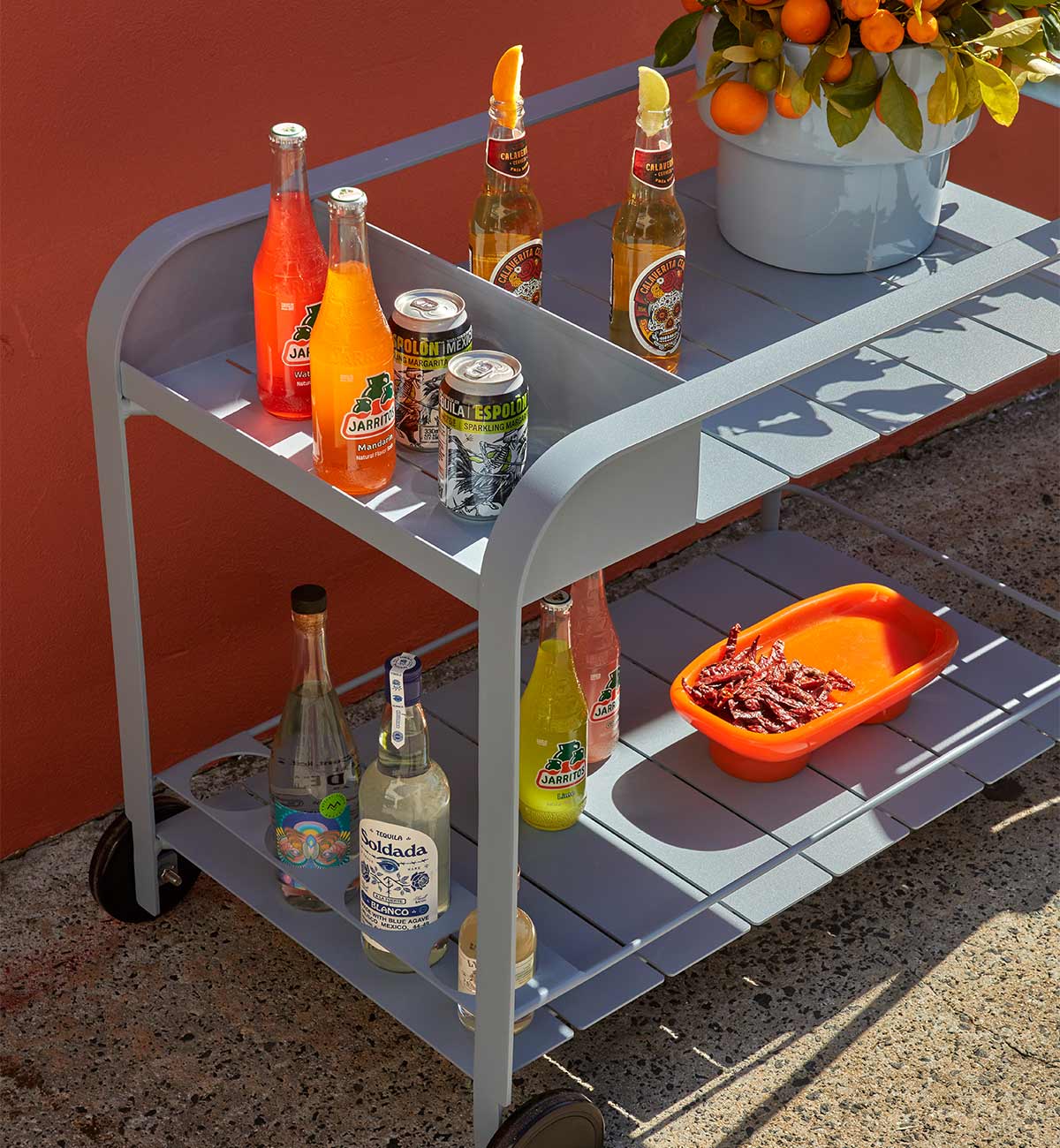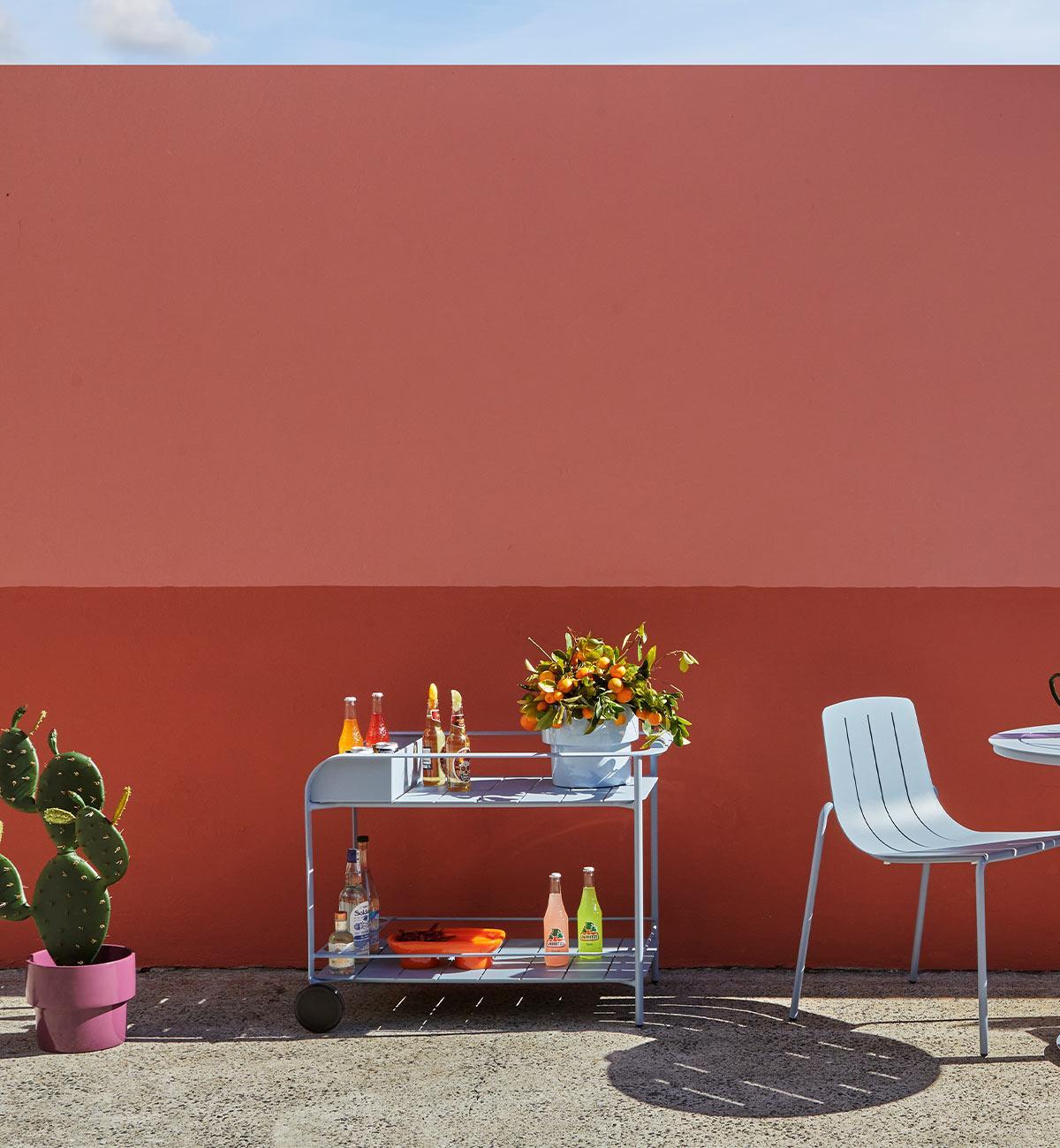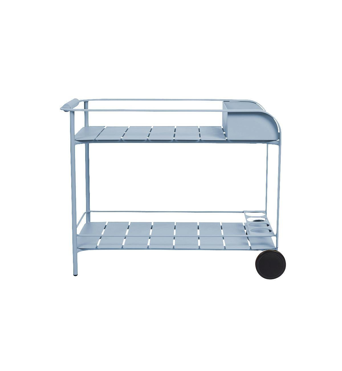 Create an instant party with our super sleek Sundowner Bar Cart. Constructed in all-weather aluminium and powder coated in a super fresh palette, this piece has been designed to pair with our outdoor dining tables and chairs. Enjoy champagne breakfast, long lazy lunches, poolside aperitivo and garden sundowners.