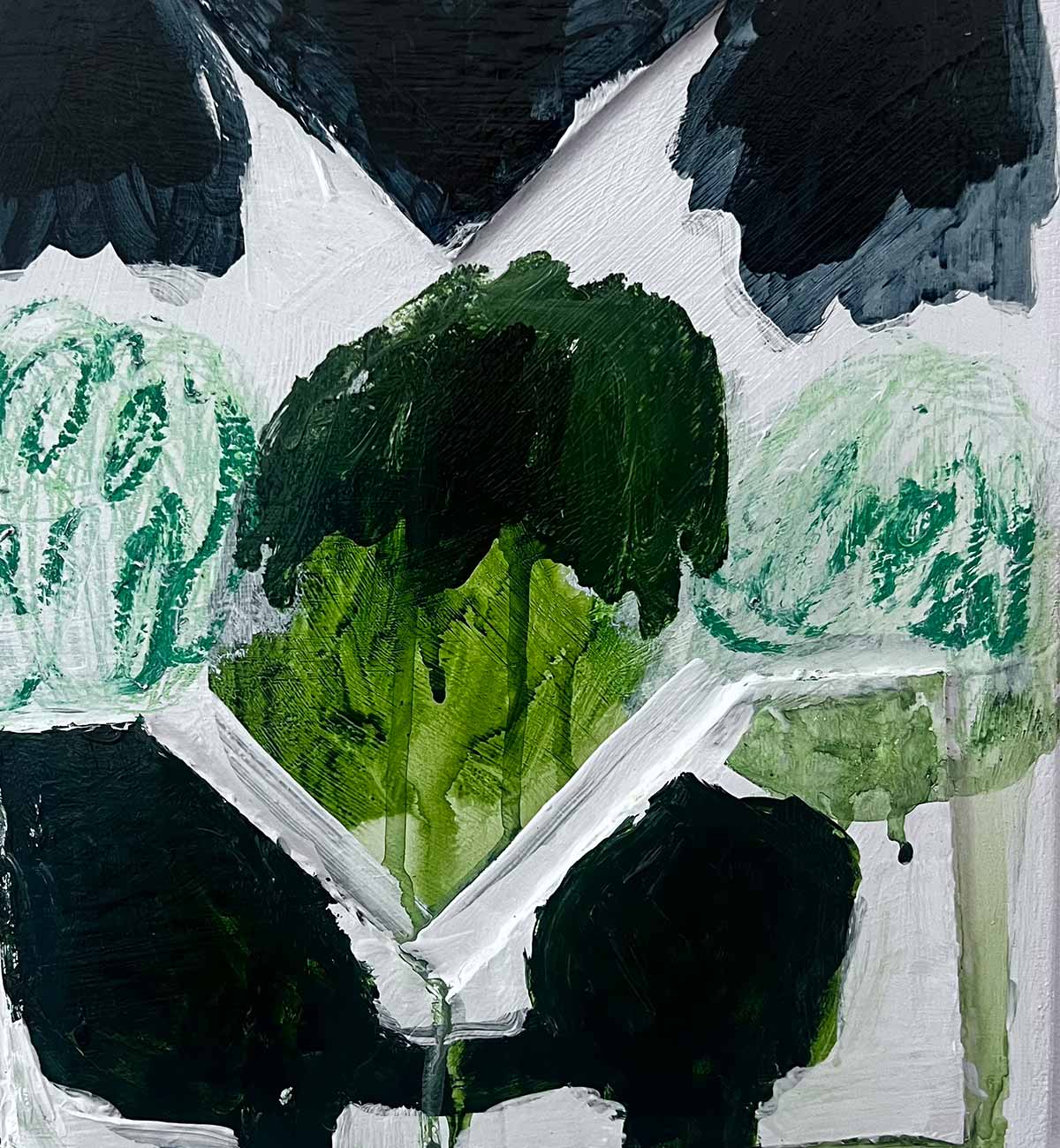 The Forest Collection emerged in the middle of spring, a time when I had never felt so much green surrounding me. I breathed it in - clean, fresh, alive. From my studio window, the long grass and trees glowed into my space, and without thinking, I began to paint and draw. It felt like a kind of renewal. The days shifted between bright and overcast, the sky often a soft white, and that wild spring wind moving through everything.