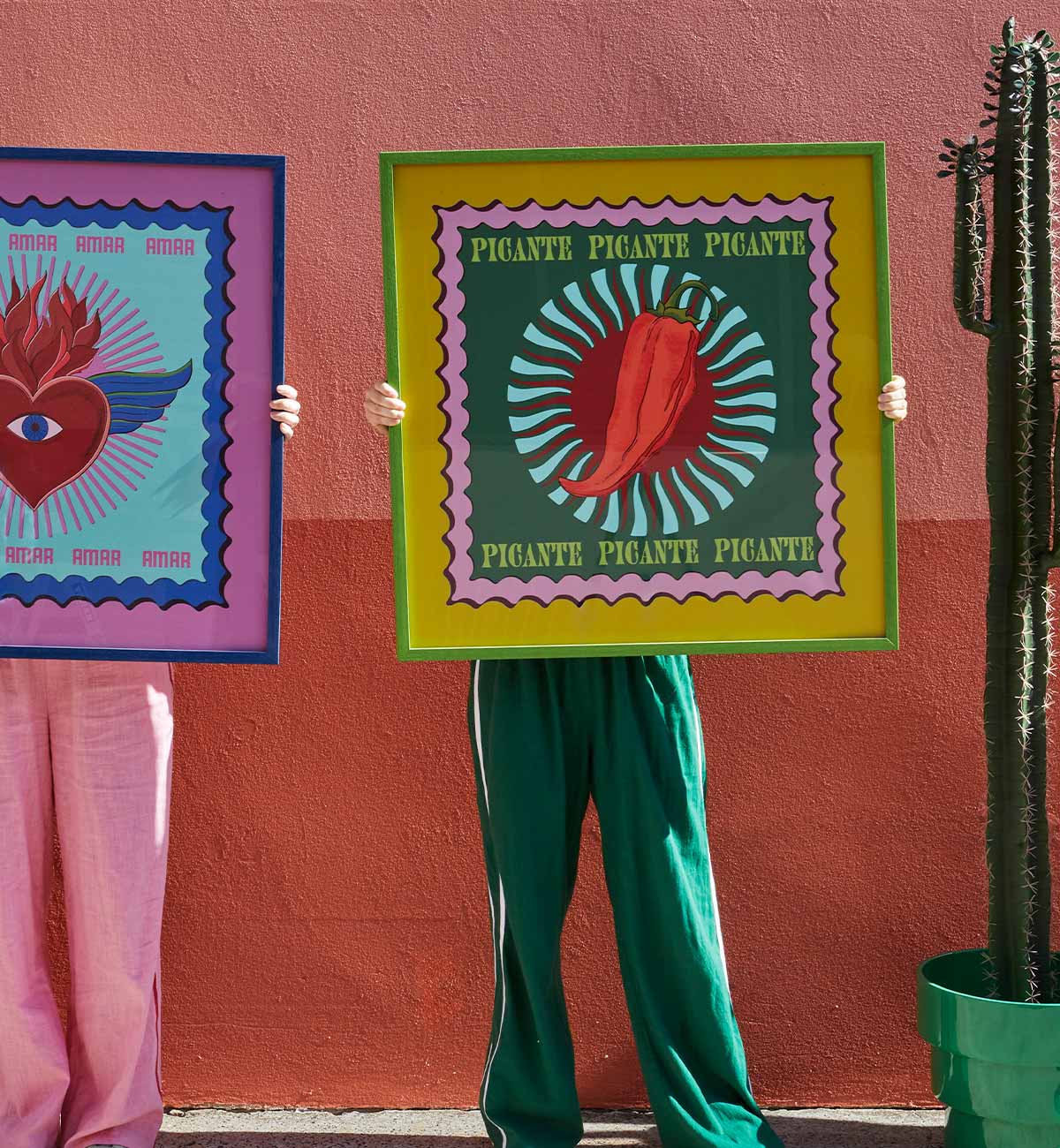 Inspired by the sun-soaked energy, vibrant produce and playful spirit of Mexico, this collection features eight bold, original designs - each a celebration of pattern, iconography and colour. Available framed or unframed (with a custom-coloured frame selected to complement each piece), these 80 x 80 cm statement prints are designed to be displayed solo or styled together for maximum impact.