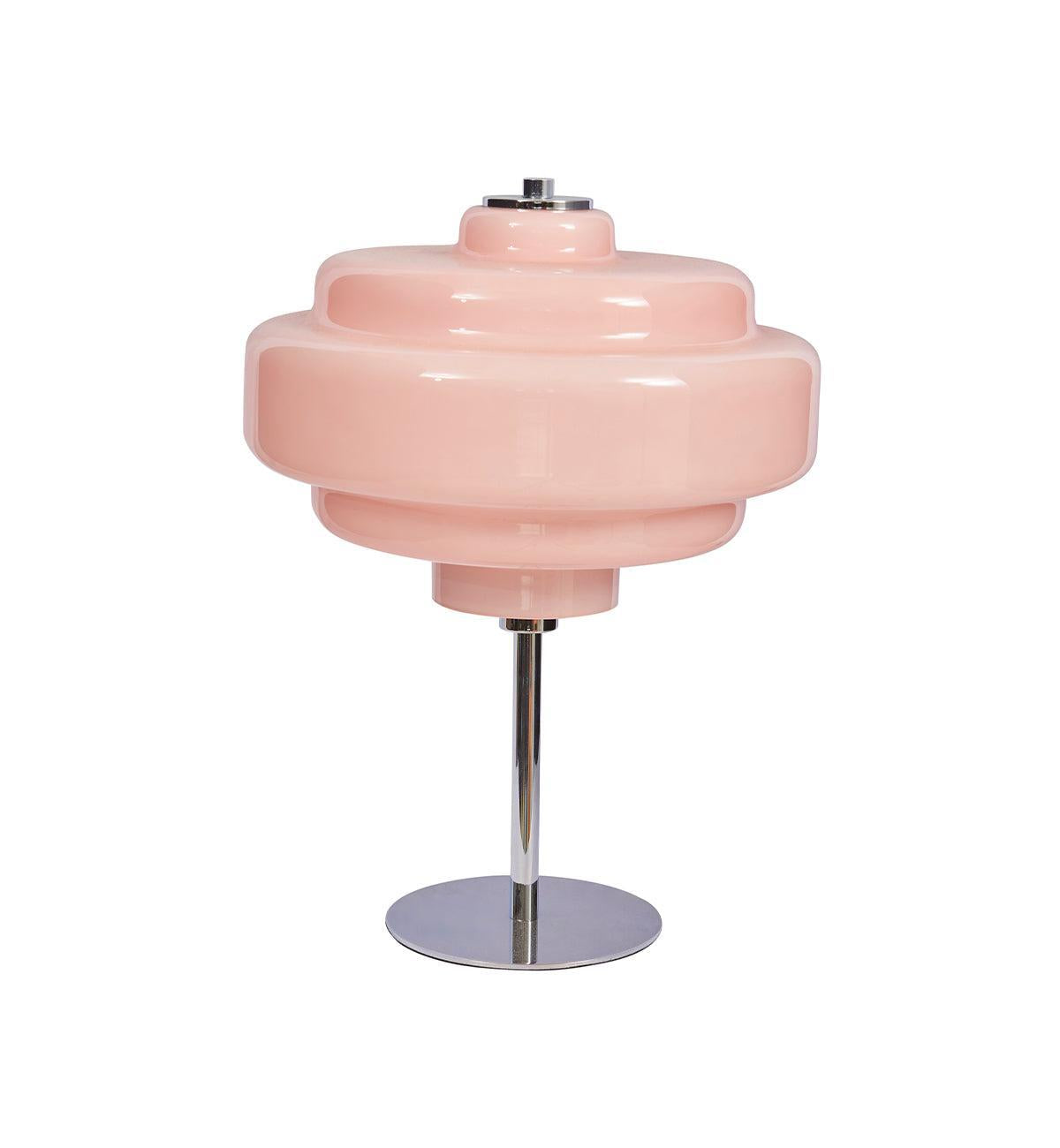 Meet the Flossy Table Lamp, compact, glossy and full of personality. Featuring a sculptural, tiered glass shade set atop a sleek chrome stem and base, Flossy delivers instant retro appeal with a modern polish.