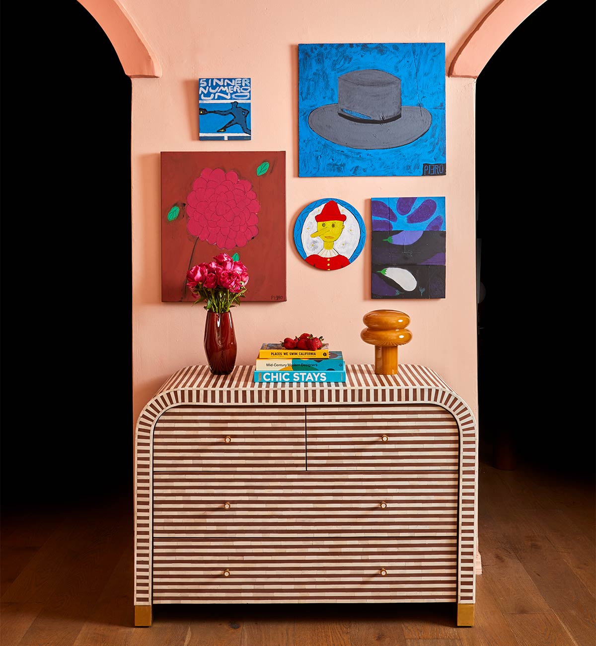 Curved, contemporary and elegant, our striped and shapely Bone Inlay commode presents a fresh update to its more traditional predecessor.