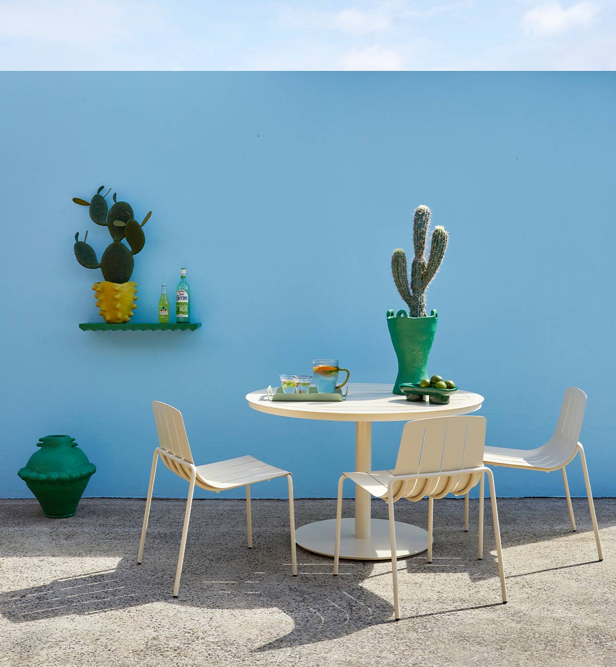 Constructed in all-weather aluminium and powder coated in a super fresh palette, this collection has been designed to mix or match with our Slim Dining Chairs and is perfectly suited to smaller spaces.