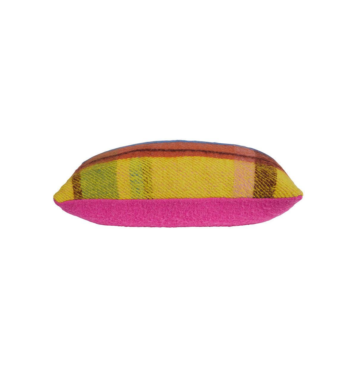 Meet The Lodge Cushion, a vibrant twist on classic chalet check. Featuring a bold, painterly plaid in sun-warmed orange, alpine blue and citrus yellow on the front, paired with a saturated hot pink reverse, it’s lodge style turned all the way up.